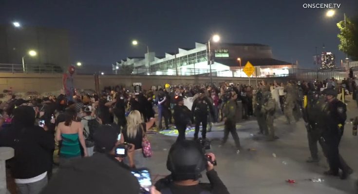 Much like Friday night’s demonstration, Saturday’s downtown rally seemed peaceful in the beginning, but by late that night the LAPD had issued a citywide tactical alert and ordered protesters to disperse after some threw “bottles, rocks and industrial size fireworks” at law enforcement officers.